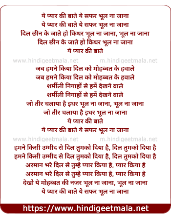 Lyrics of Ye Pyaar Ki Baaten Ye Safar Bhul Na Jaanaa - ये प्यार की बाते ये सफर भूल ना जाना