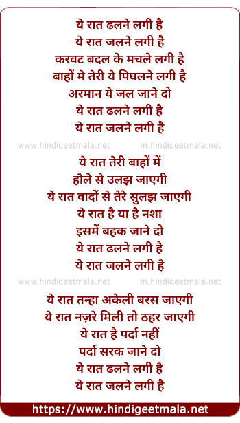 Lyrics of Ye Raat Dhalne Lagi Hai - ये रात ढलने लगी है