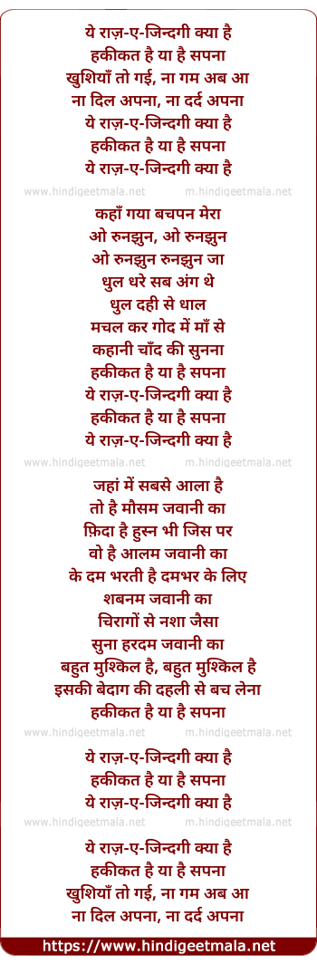 Lyrics of Ye Raaz E Zindagi Kya Hai - ये राज़-ए-जिन्दगी क्या है