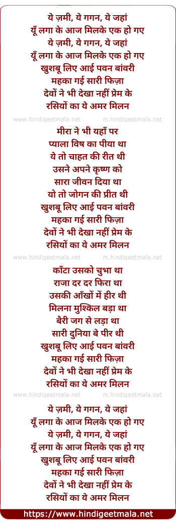 Lyrics of Ye Zameen Yeh Gagan - ये ज़मी, ये गगन, ये जहां