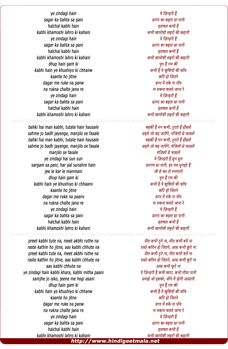 Lyrics of Ye Zindagi Sagar Ka Behta Sa Pani - ये ज़िन्दगी सागर का बहता सा पानी