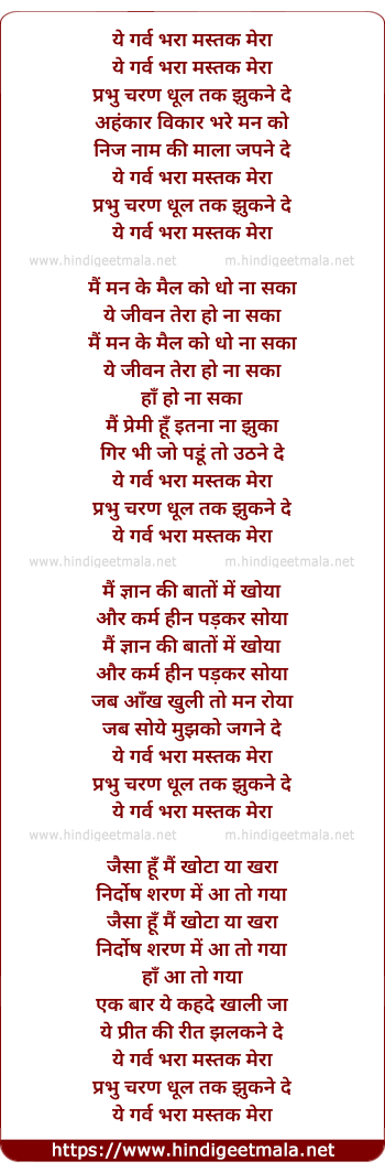Lyrics of Yeh Garv Bhara Mastak Meraa - ये गर्व भरा मस्तक मेरा
