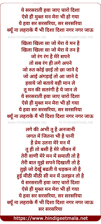 Lyrics of Ye Hawa Sar Sarsariya - ये हवा सर सरसरिया