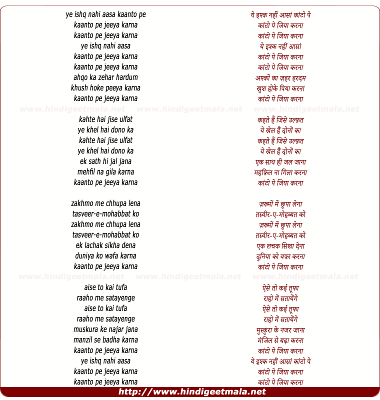 Lyrics of Yeh Ishq Nahi Aasan Kanto Pe Jiya - ये इश्क नहीं आसां कांटो पे जिया