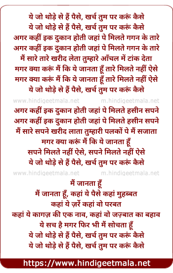 Lyrics of Ye Jo Thode Se Hai Paise - ये जो थोड़े से हैं पैसे