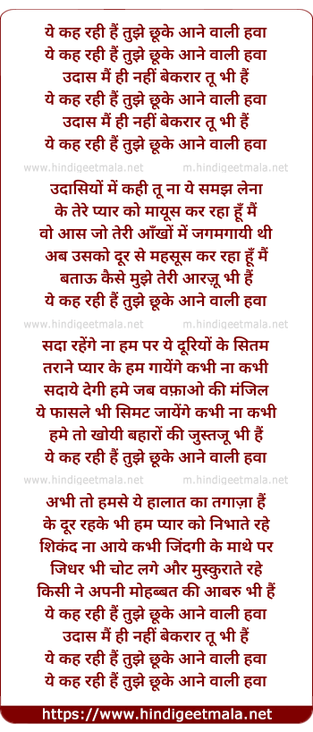 Lyrics of Yeh Keh Rahi Hai - ये कह रही हैं तुझे छूके आने वाली हवा