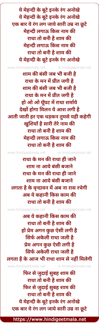 Lyrics of Ye Mehandi Ke Bute Inke Rang Anokhe - ये मेहन्दी के बूटे इनके रंग अनोखे
