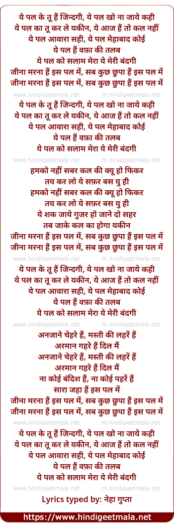 Lyrics of Yeh Pal Ke Tu Hai Zindagi - ये पल के तू हैं जिन्दगी
