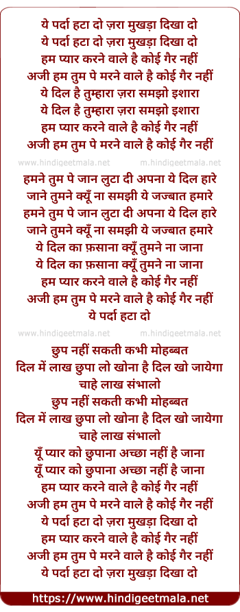 Lyrics of Yeh Parda Hata Do, Jara Mukhda Dikha Do - ये पर्दा हटा दो, ज़रा मुखड़ा दिखा दो