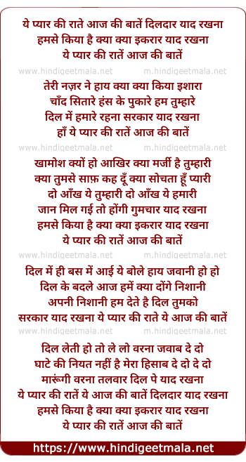 Lyrics of Yeh Pyar Ki Raatein Yeh Aaj Ki Baatein Dildaar Yaad Rakhna - ये प्यार की राते आज की बातें दिलदार याद रखना