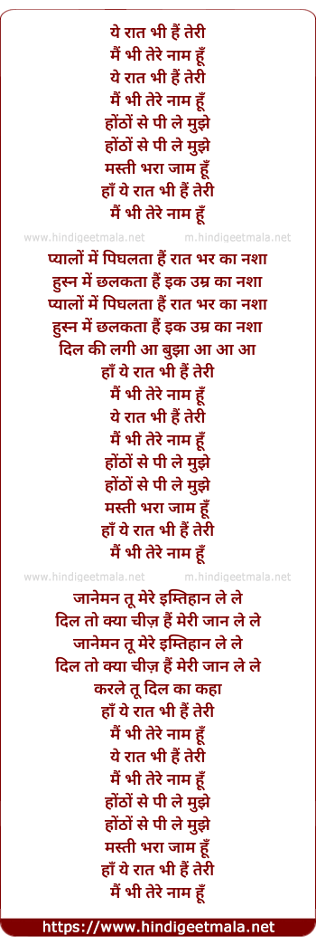 Lyrics of Yeh Raat Bhi Hai Teri - ये रात भी हैं तेरी
