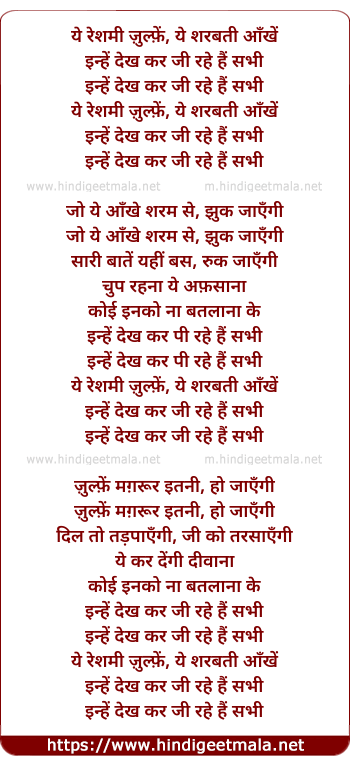 Lyrics of Ye Reshamee Julfe, Ye Sharabatee Aankhe - ये रेशमी ज़ुल्फ़ें, ये शरबती आँखें