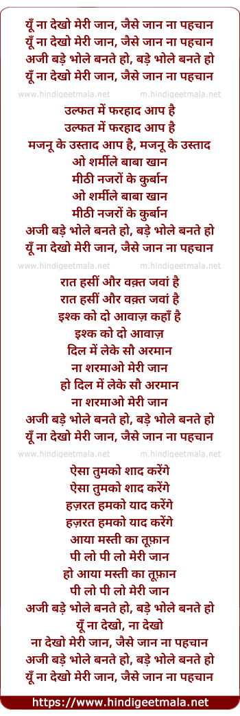 Lyrics of Yu Na Dekho Meri Jaan - यूँ ना देखो मेरी जान