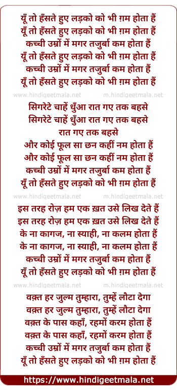 Lyrics of Yu Toh Hanste Huye - यूँ तो हँसते हुए लड़को को भी ग़म होता हैं