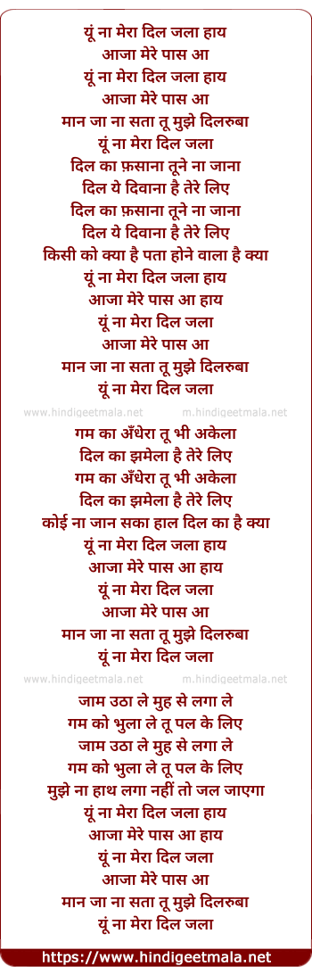 Lyrics of Yun Na Mera Dil Jala - यूं ना मेरा दिल जला