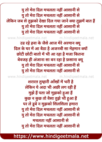 Lyrics of Yun To Mera Dil Machalta Nahi Aasani Se - यु तो मेरा दिल मचलता नहीं आसानी से