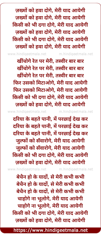 Lyrics of Zakhmon Ko Hawa Doge - ज़ख्मों को हवा दोगे, मेरी याद आयेगी