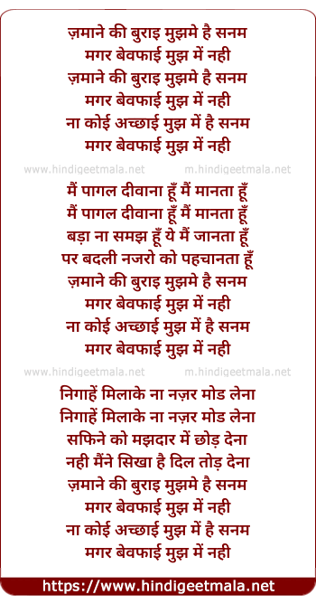 Lyrics of Zamane Ki Buraai Mujh Me Hai Sanam - ज़माने की बुराइ मुझ मे है सनम