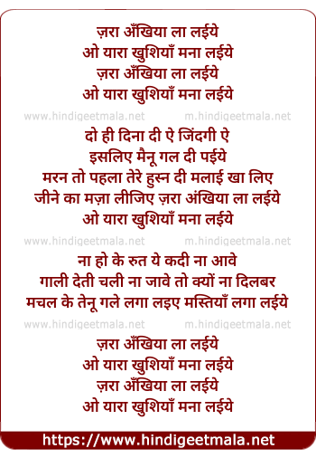 Lyrics of Zara Aankhiyan La Laiye O Yara Khushiya Mana Laiye - ज़रा अँखिया ला लईये ओ यारा खुशिया मन लईये