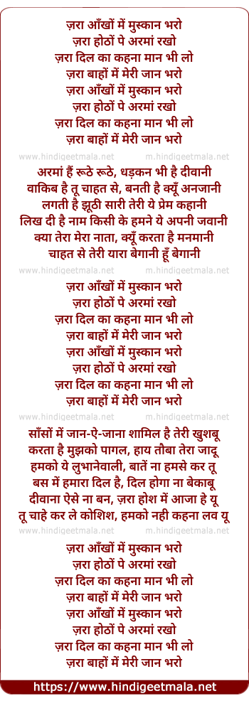 Lyrics of Zara Aankhon Mein Muskaan Bharo - ज़रा आँखों में मुस्कान भरो