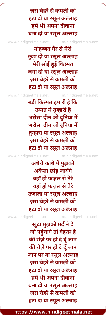 Lyrics of Zara Chehare Se Kamli Ko Hata Do - ज़रा चेहरे से कमली को