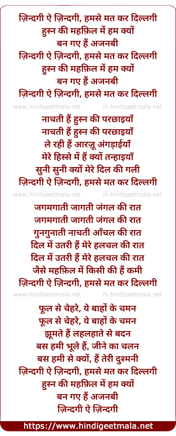 Lyrics of Zindagi Ae Zindagi, Humse Mat Kar Dillagi - ज़िन्दगी ऐ ज़िन्दगी, हमसे मत कर दिल्लगी