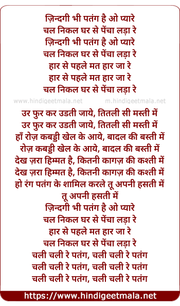 Lyrics of Zindagi Bhi Patang Hai O Pyare - ज़िन्दगी भी पतंग है ओ प्यारे