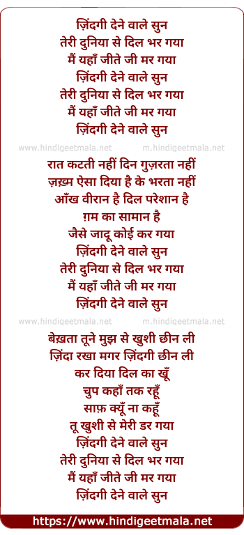 Lyrics of Zindagi Denewale Sun, Teri Duniya Se Dil Bhar Gaya - ज़िंदगी देने वाले सुन तेरी दुनिया से दिल भर गया