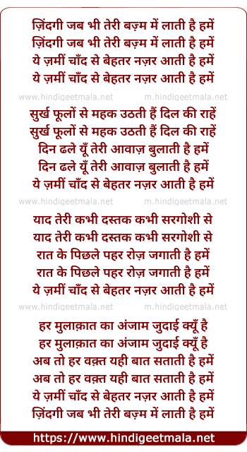 Lyrics of Zindagi Jab Bhi Teri Bazm Men Laati Hai Hamen - ज़िंदगी जब भी तेरी बज़्म में लाती है हमें