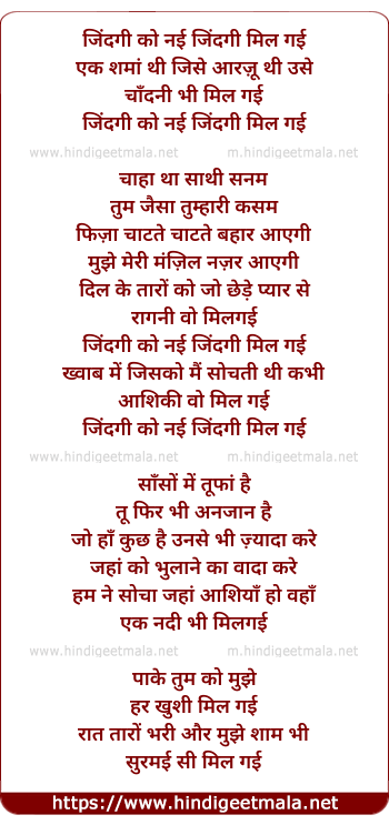 Lyrics of Zindagi Ko Nayi Zindagi Mil Gayi - जिंदगी को नई जिंदगी मिल गई