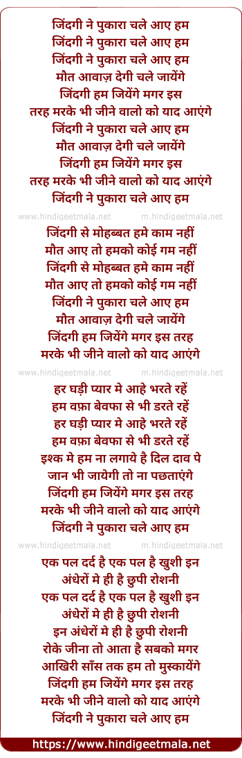 Lyrics of Zindagi Ne Pukara Chale Aaye Hum - जिंदगी ने पुकारा चले आए हम