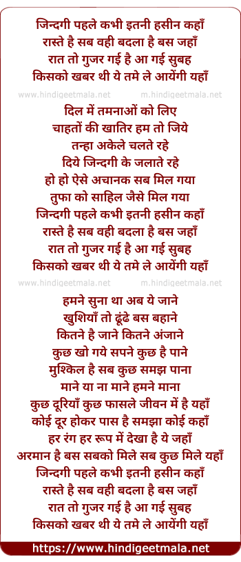 Lyrics of Zindagi Phele Kabhi Itani Hasin Kahaan - जिन्दगी पहले कभी इतनी हसीन कहाँ