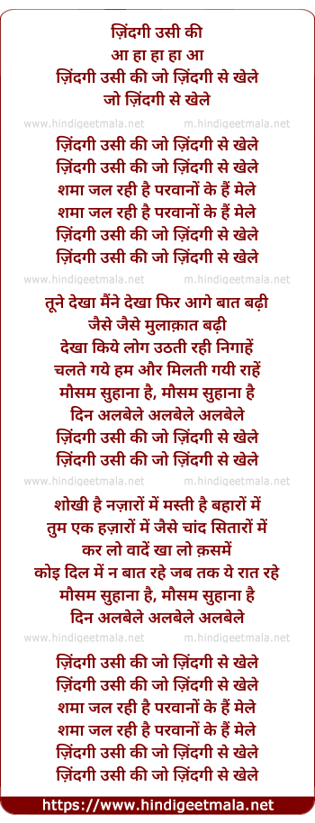 Lyrics of Zindagi Usi Ki Hai Jo Zindagi Se Khele - ज़िंदगी उसी की जो ज़िंदगी से खेले