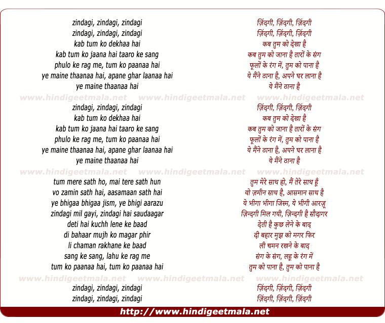 Lyrics of Zindagi Zindagi Zindagi Kab Tum Ko Dekhaa Hai - ज़िंदगी ज़िंदगी ज़िंदगी कब तुम को देखा है