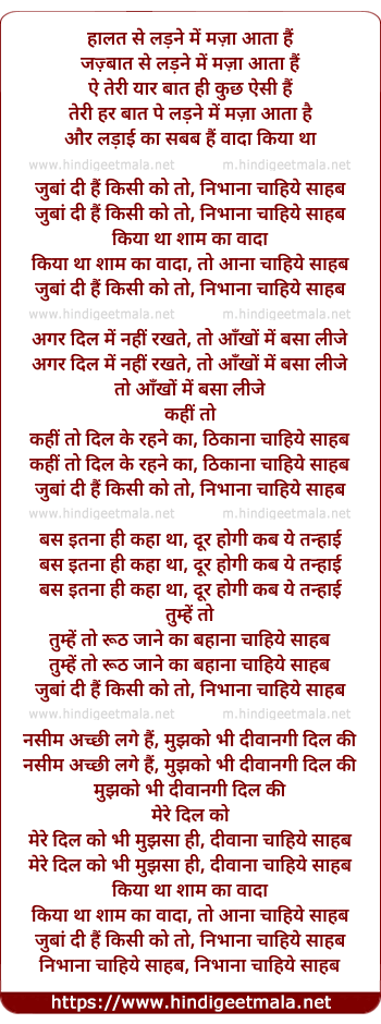 jubaan di hain kisi ko to, nibhana chahiye saahab