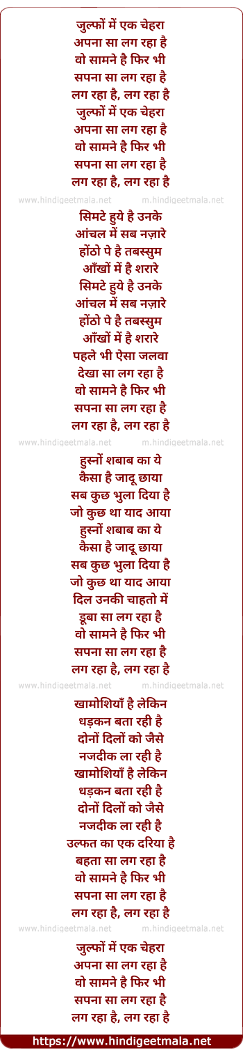 Lyrics of Zulfon Mein Ik Chehra - जुल्फों में एक चेहरा