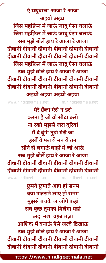 Lyrics of Zum Zum Aiyo Aiyaa, Divaani, Sab Mujhe Bolen - झूम झूम अइयो अइया दीवानी, सब मुझे बोलें